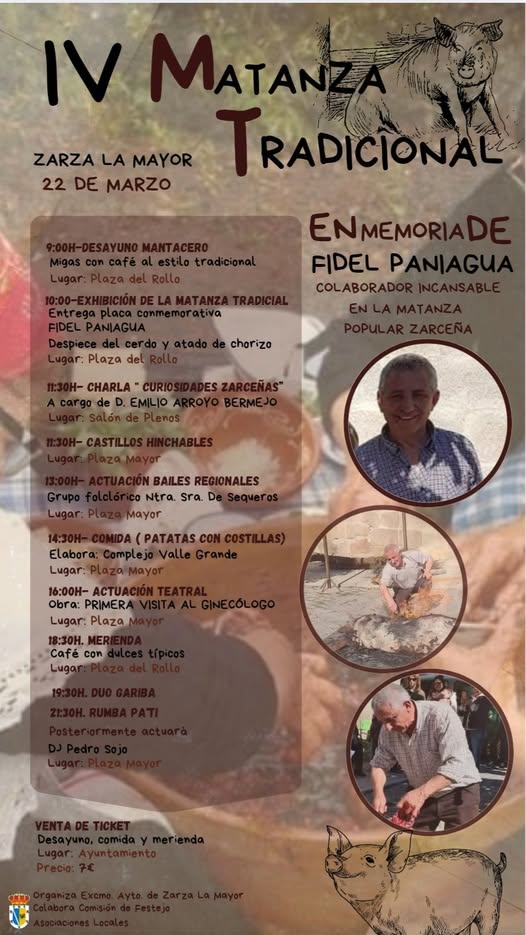 Cartel anunciador de nuestra IV MATANZA TRADICIONAL ZARCEÑA, que este año será el sábado 22 de marzo. A partir de mañana podéis adquirir los tickets en el Ayuntamiento y por la tarde en la Biblioteca de 16:00 a 20:00 h.
