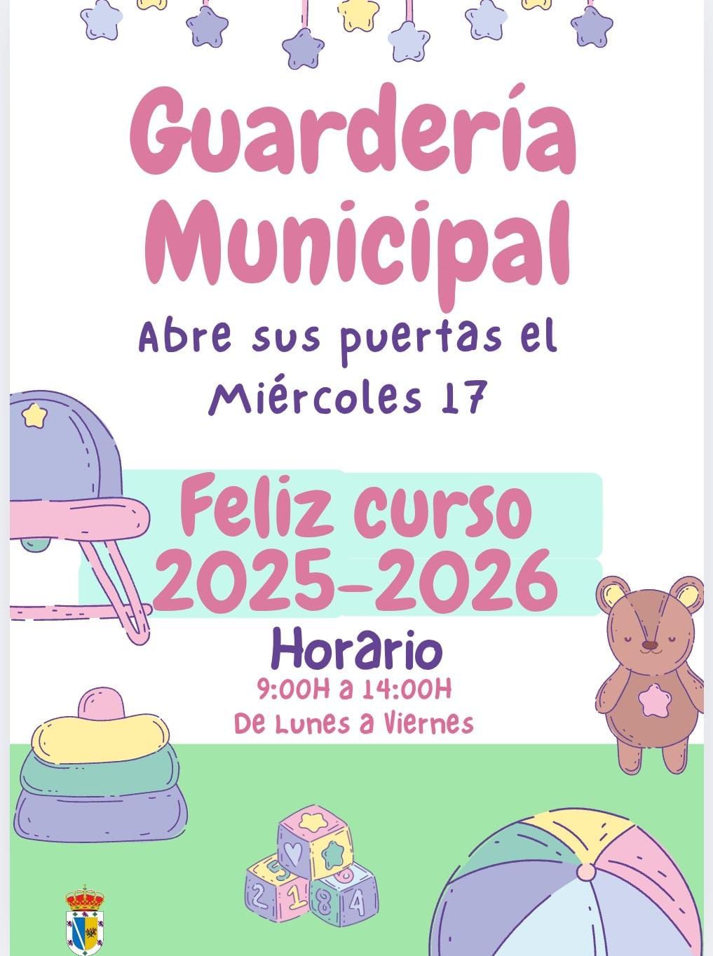 Apertura Guardería municipal 12 septiembre 2025 El próximo miércoles 17, se abrirá la Guardería Municipal para el próximo curso. El horario será de 09:00 a 14:00 h, de lunes a viernes.