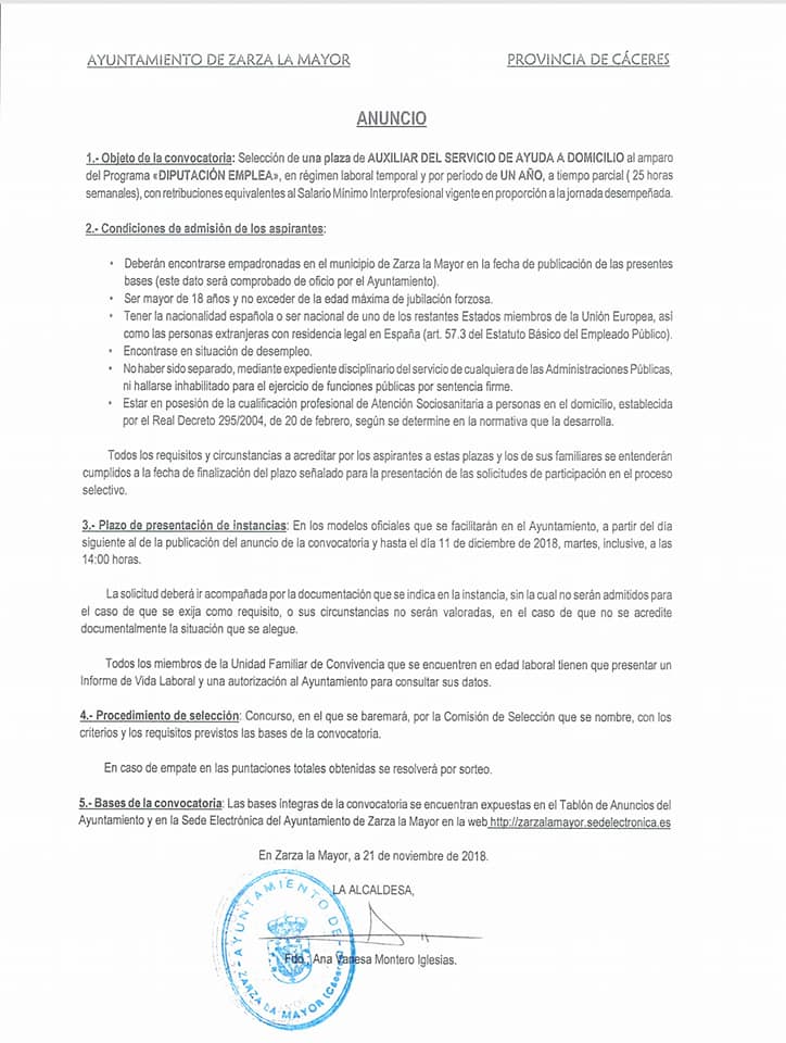 El Ayuntamiento de Zarza La Mayor anuncia la convocatoria de TRES plazas, dos de Peón de Servicios Múltiples y una de Auxiliar del Servicio de Ayuda a Domicilio al amparo del Programa "Diputación Emplea". A continuación, se adjuntan las condiciones de admisión de los aspirantes.